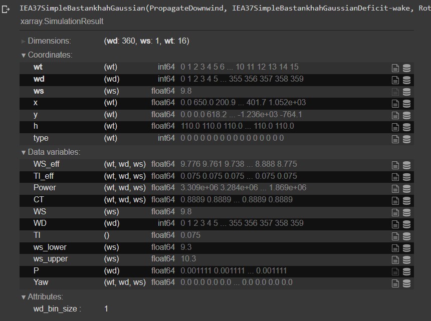 We can run the wind farm simulation by calling the wind farm model. It runs for all the wind directions for default configuration, and speed is also the default. This returns the simulation result, a xarray dataset with additional methods and attributes. Let’s see the example.